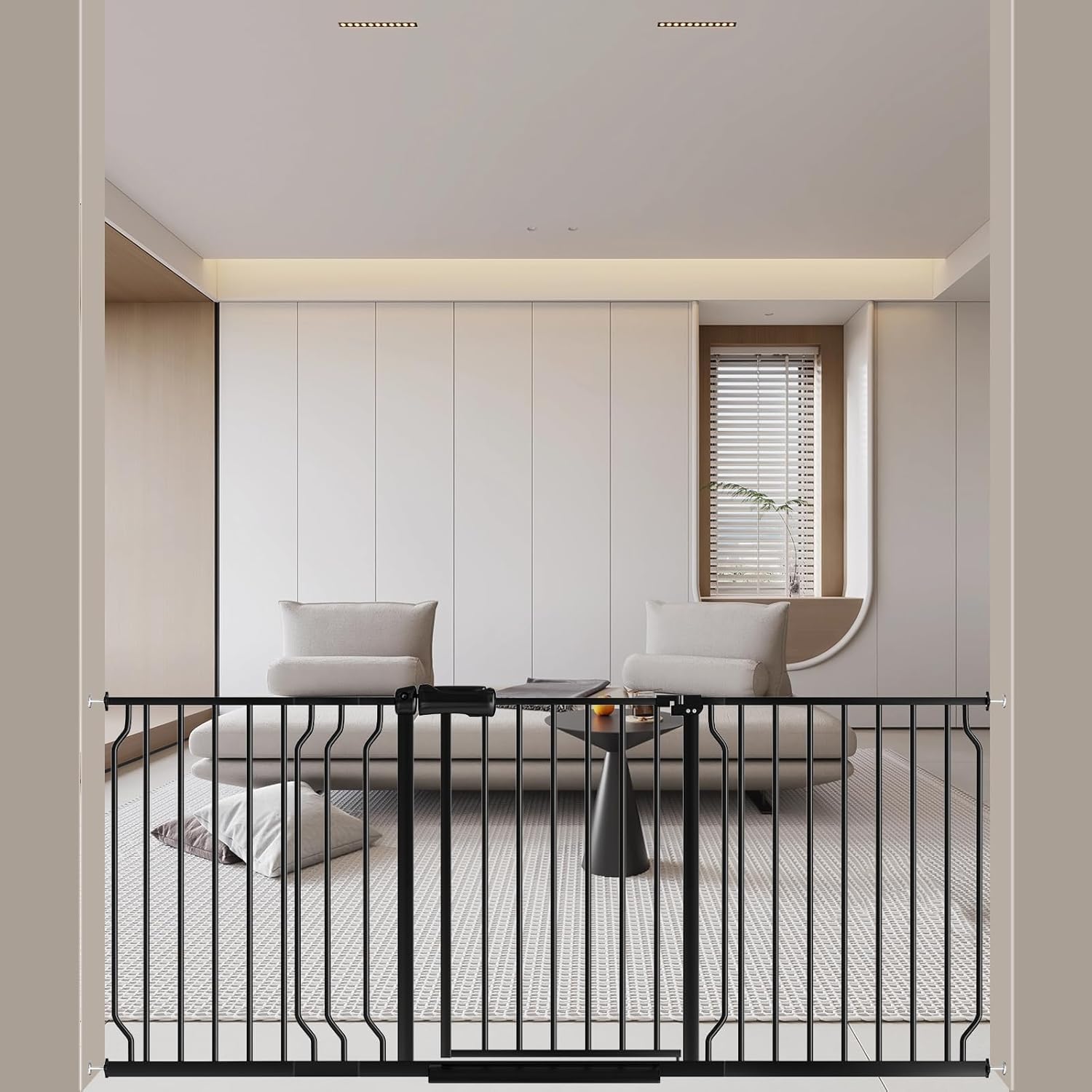- 【Durable and Safety】The extra wide pressure mounted puppy gate is made of sleek thick steel,make a safe protective extra long pet gate. The spacing between the round tubes is 2 ",so it is a perfect choice as a black pet gate, which can effectively restrict the entry and exit of pets. After manual testing, the cat dog gate for door can withstand 180 pounds of pull