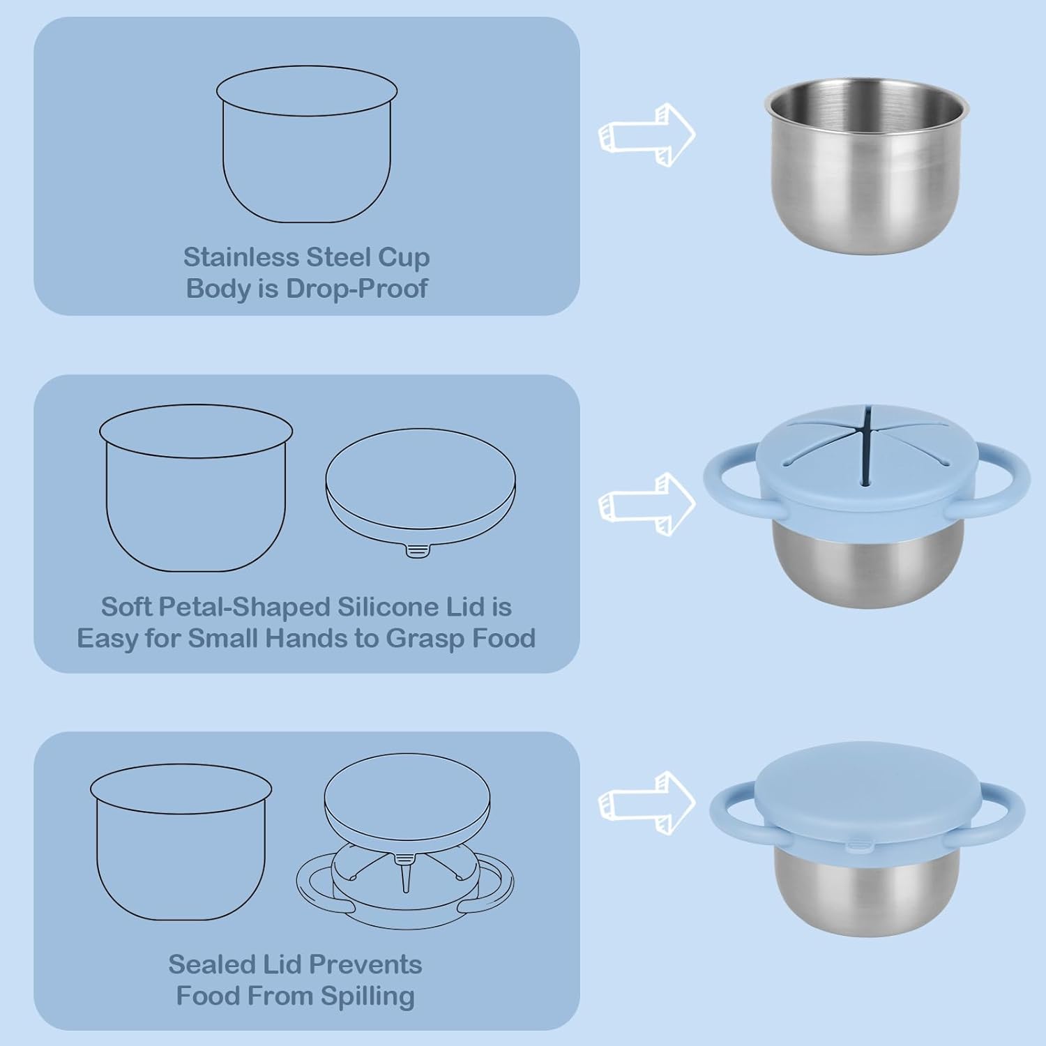 - 3-In-1 Spill-Proof Design: Our toddler snack cups no spill features a unique 3-in-1 design, specially designed for busy toddlers and even busier parents. It comes with a durable stainless steel base and a soft petal-shaped silicone lid, allowing little hands to easily grab snacks and preventing food from spilling everywhere. The included leak-proof travel lid locks in freshness and prevents leaks—no more worrying about messes on the couch, in the car, or in your bag!